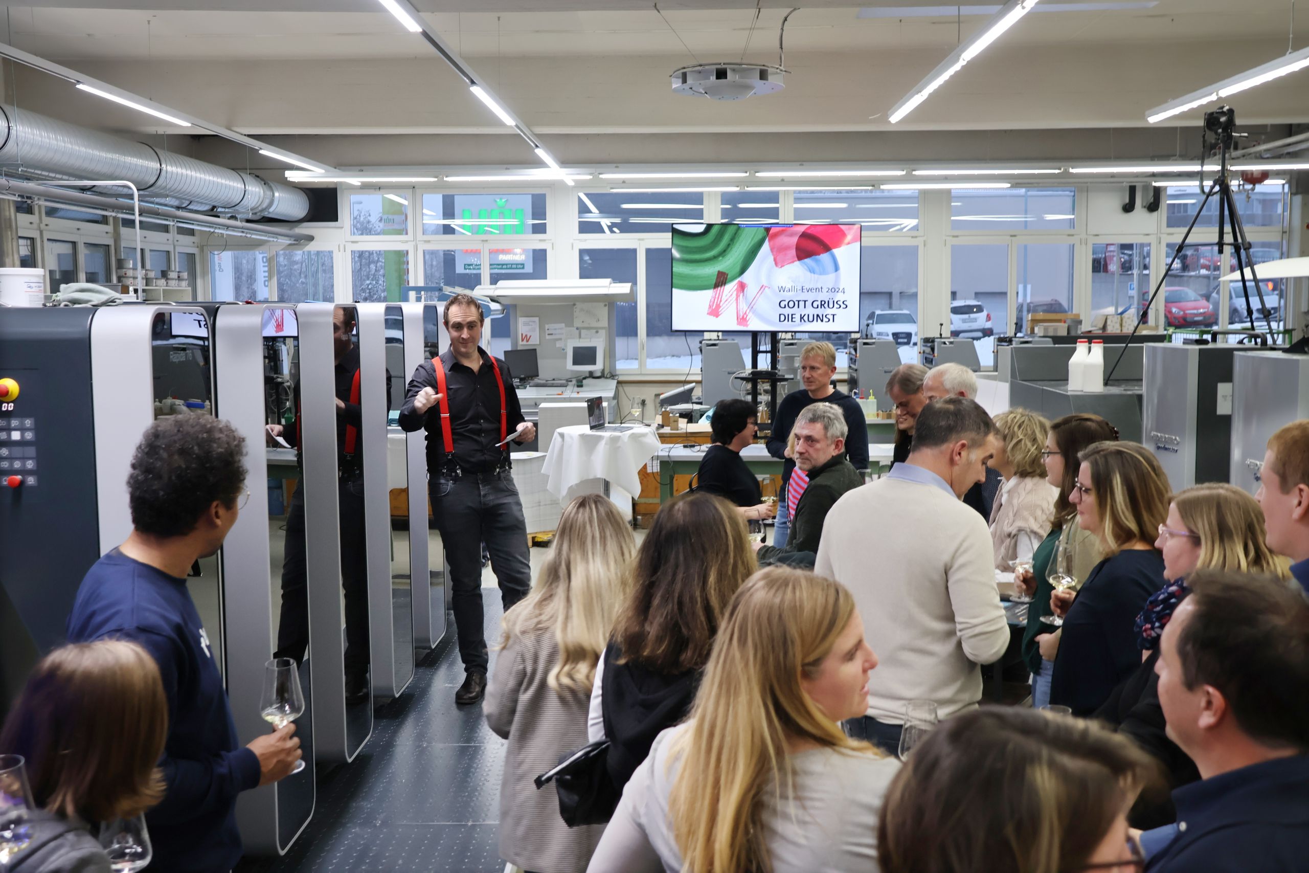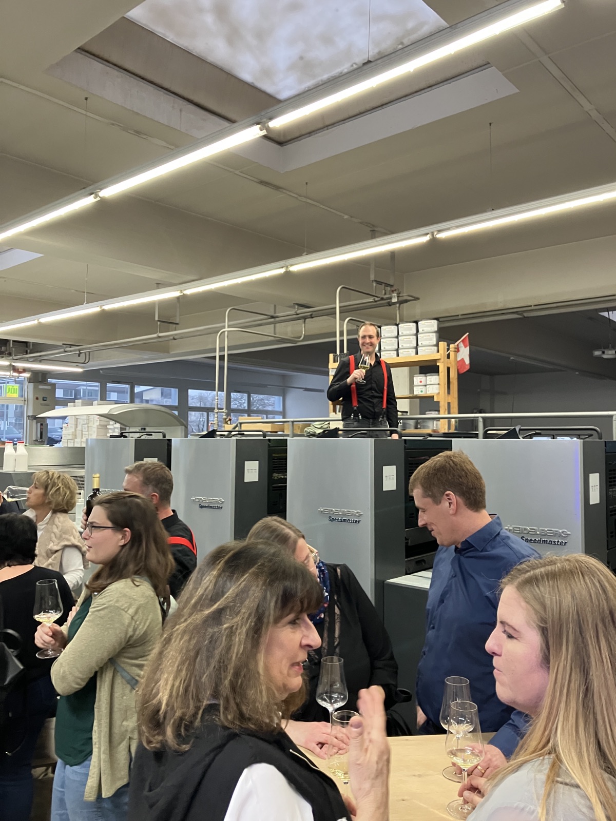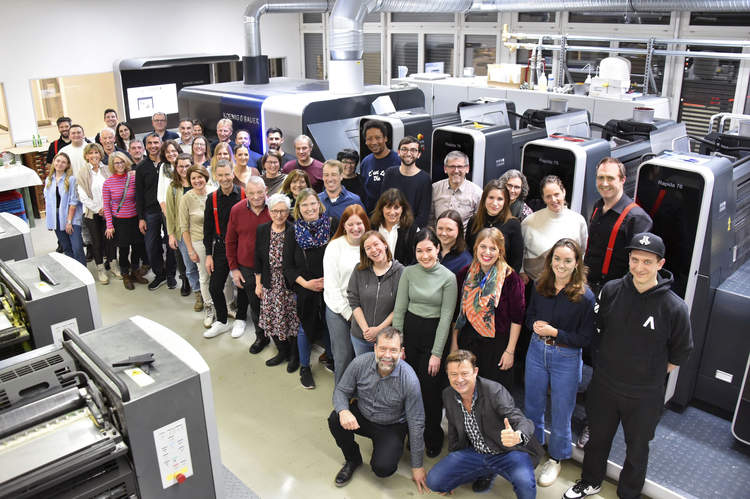 Gestartet wurde mit einem Apéro im hauseigenen Drucksaal. Die Geschäftsleitung und das Druck-Team stellten gemeinsam die neue Rapida 76 von Koenig&Bauer mit ihren zukunftsweisenden Möglichkeiten vor. Dabei wurde ein Vorzeige-Druck demonstriert. Das Flaggschiff konnte von allen Seiten bestaunt und die Profis mit Fragen ausgequetscht werden.