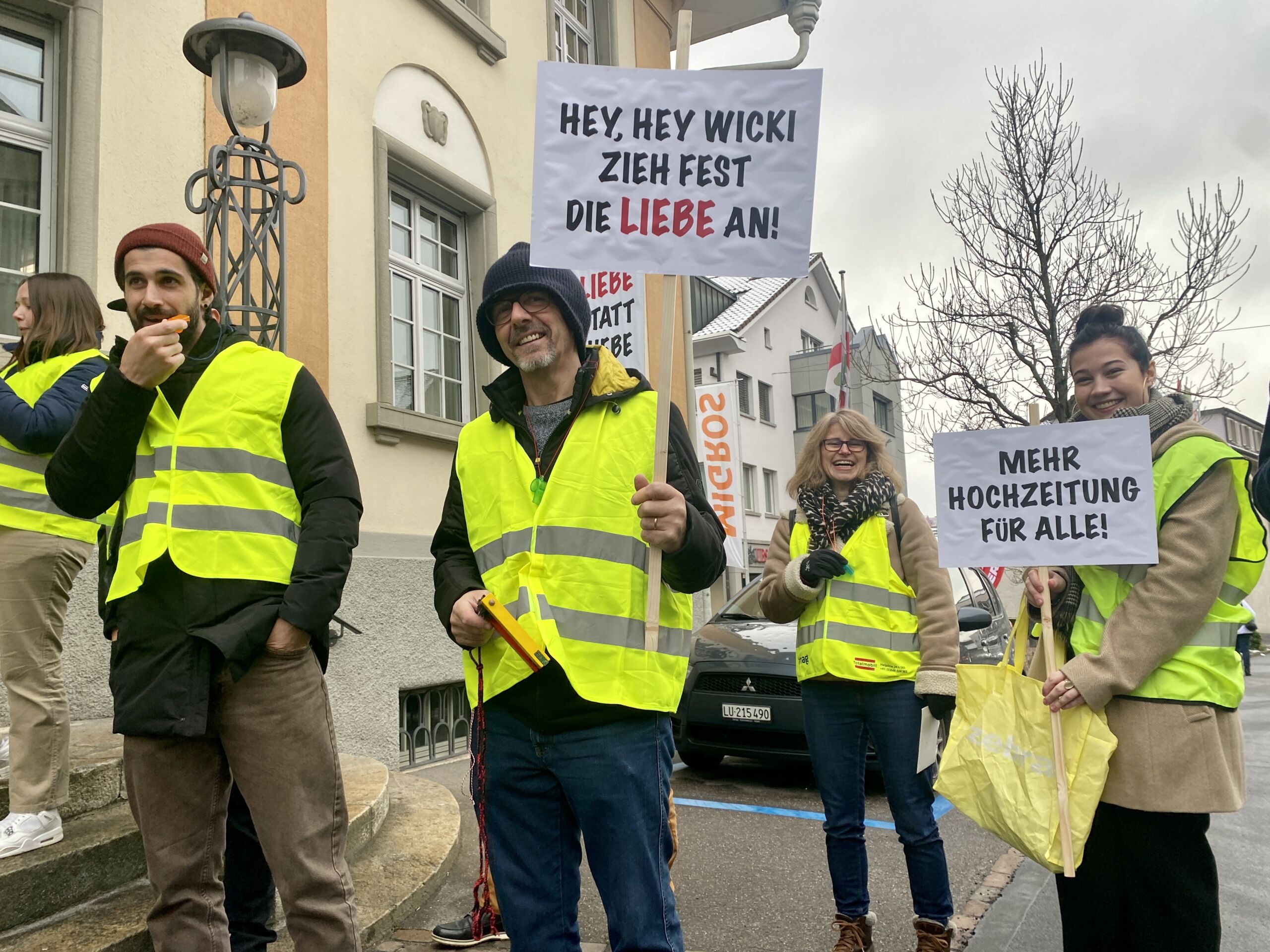 Als unser Geschäftsleiter Patrick Wicki und seine frisch angetraute Eliane aus dem Standesamt traten, konnten sie ihren Augen nicht trauen! Wer hätte gedacht, dass die Wallimänner und -frauen geschlossen in den Streik treten würden? Mit Trillerpfeifen, Warnwesten und gepfefferten Slogans wie „Make Love 💕 Not Work”, „Liebe statt Hiebe”, „Walli Love weiss wie”, zogen sie vor das Rathaus in „Hofdere“, um die beiden „im Namen der Liebe“ zu überraschen.